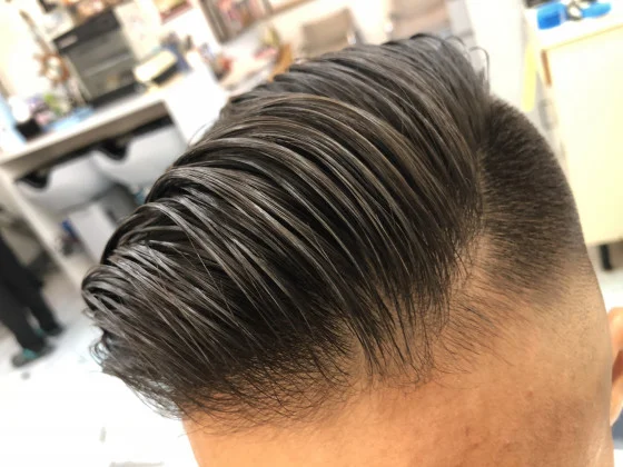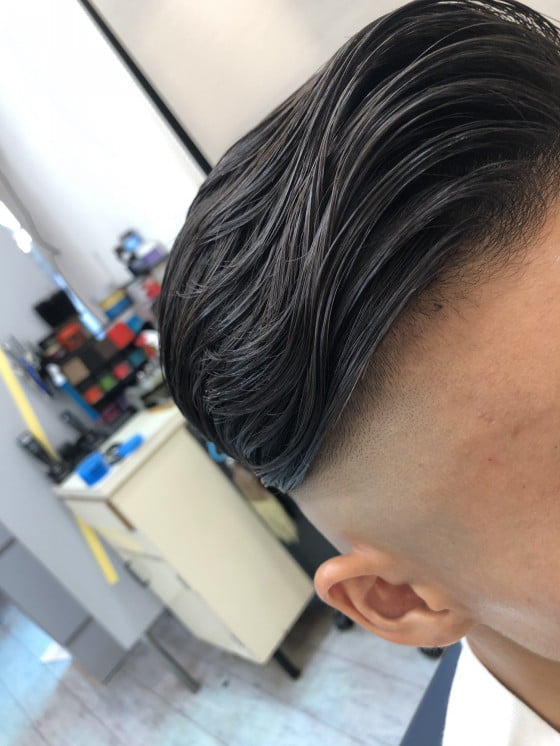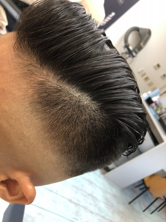 ブロックの境い目まで剃るツーブロックもありますが、ややグラデーション(ボカシ)を入れる事でスタイルのニュアンスやキマリ方がだんぜん変わります。仕上がりはコームオーバーポンパドール。男らしくカッコよく。色々な要素を取り込んだアシメスタイルです👍✨✨✨