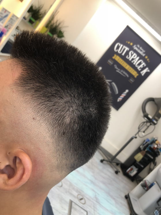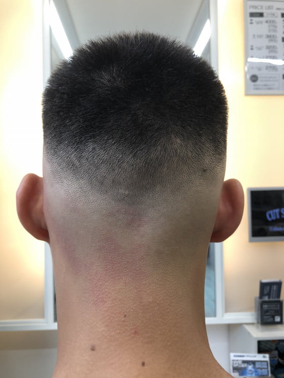 80年代位でしょうか、スポーツ刈りといったらこんな感じでしたね。ただ、当時はトップをスゴく平にしたフラットトップにカドを四角にした角刈りチックなのが主流で、シルエットを四角するために耳まわりはあまり薄くしなかったですね。今流行りのスキンフェードと揃えすぎないシルエットでスパルタンなお洒落ボウズな仕上がりです👍✨✨✨