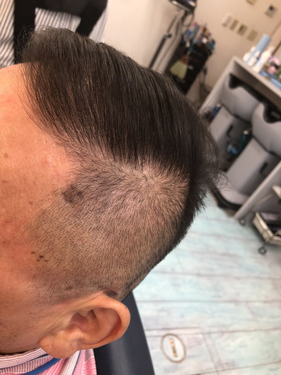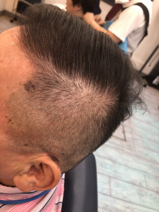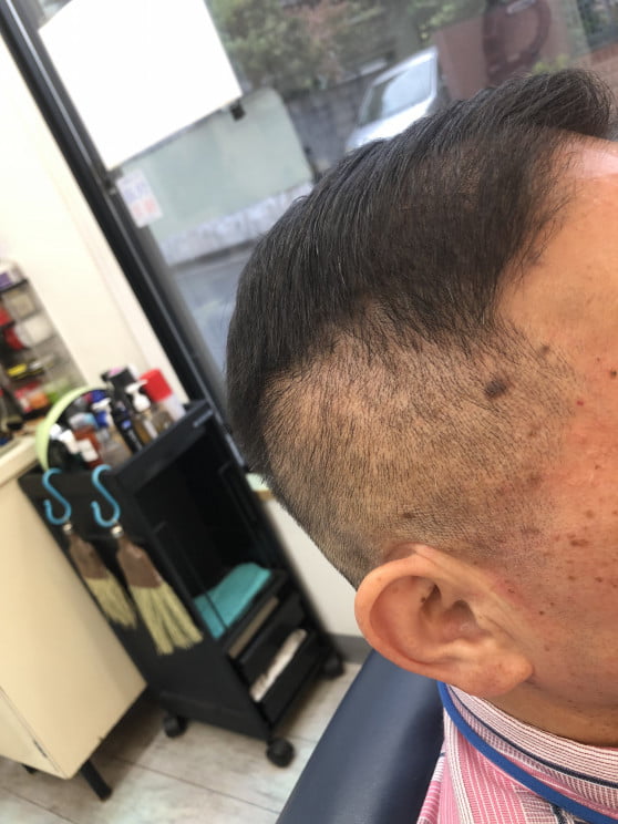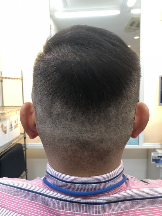 分け目近くまで刈り上げたシチサンスタイルやネオ震災刈りなんて呼ばれていますね。あまりトサカっぽくせず、また分け目に軽くフェードを入れて年代への似合わせを考えた仕上がりです。シニア世代もフェードでカッコよく清潔感のあるしあがりですね👍✨✨✨