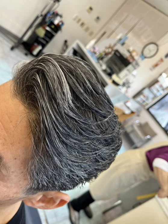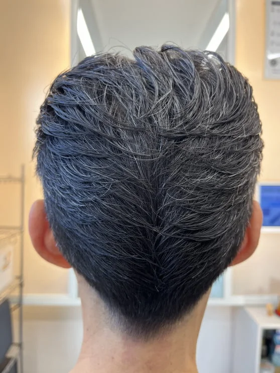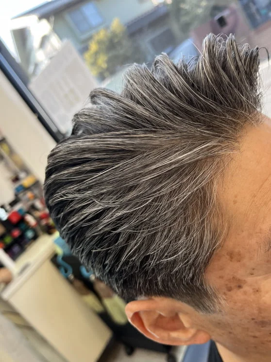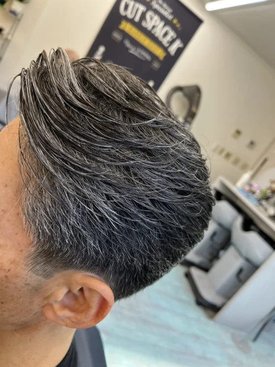 低めのフェードカットとコームオーバーのアップバング。サイドからバックはリーゼントに流します。人気のブロッシュの無香料タイプのワックスで形を決めたらケープの手ぐしが通せるスプレーでホールドしました。