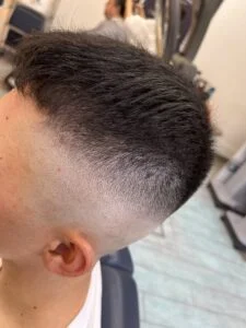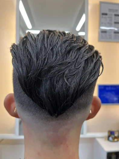 低めのスキンフェードでバックは高めに刈り上げます。