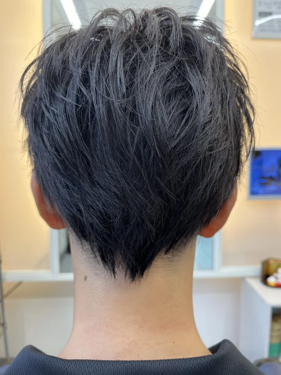 フロントは眉毛くらいとのことで、それに合わせて全体をカット。真っ直ぐな髪質で動きが出にくいので、セニングを多めに入れ、ワックスで動きを出し、スプレーで軽くホールドして完成です👍✨✨✨