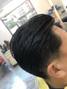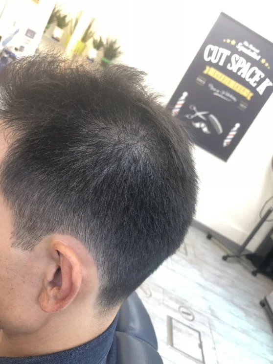 厚さは6mm位。しかし6mmのバリカンの刈り高ですともみあげや耳まわりがしっかり取りにくかったりします。そこはあまり地肌がでないように自然な仕上がりに整えました。